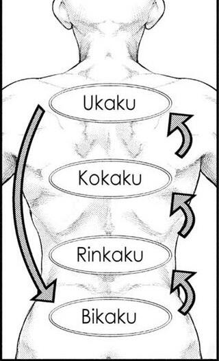 image description: a chart of a ghouls back, with labels in order from the neck to the tail bone, the lower neck is labeled “ukaku”, the shoulder blade is labeled ”kokaku”, the waist is labeled ”rinkaku” and the tailbone is labeled ”bikaku”